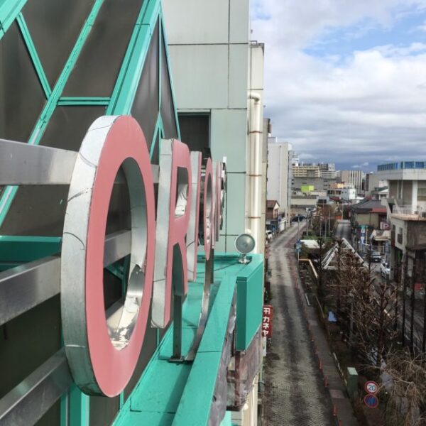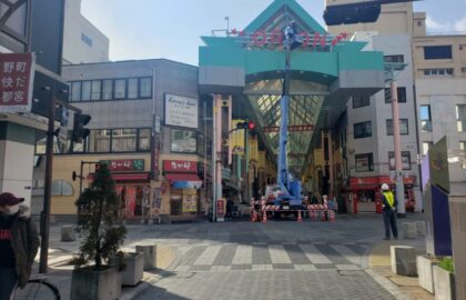 アーケード上にあるチャンネル文字4カ所の貼替を行いました。