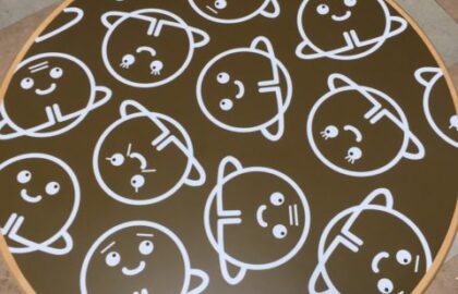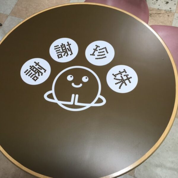 追加でのご依頼を頂きました。フードコートにある丸テーブルにシェイシェイパールのキャラクターを数パターン貼らせて頂きました。