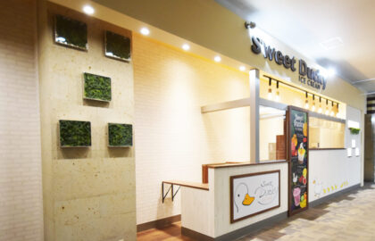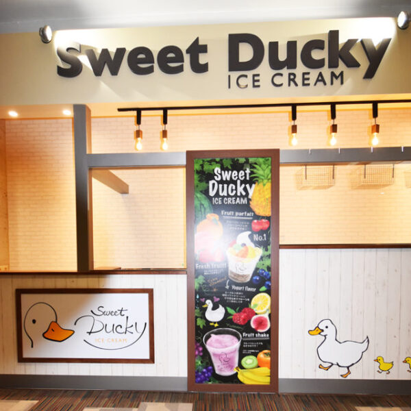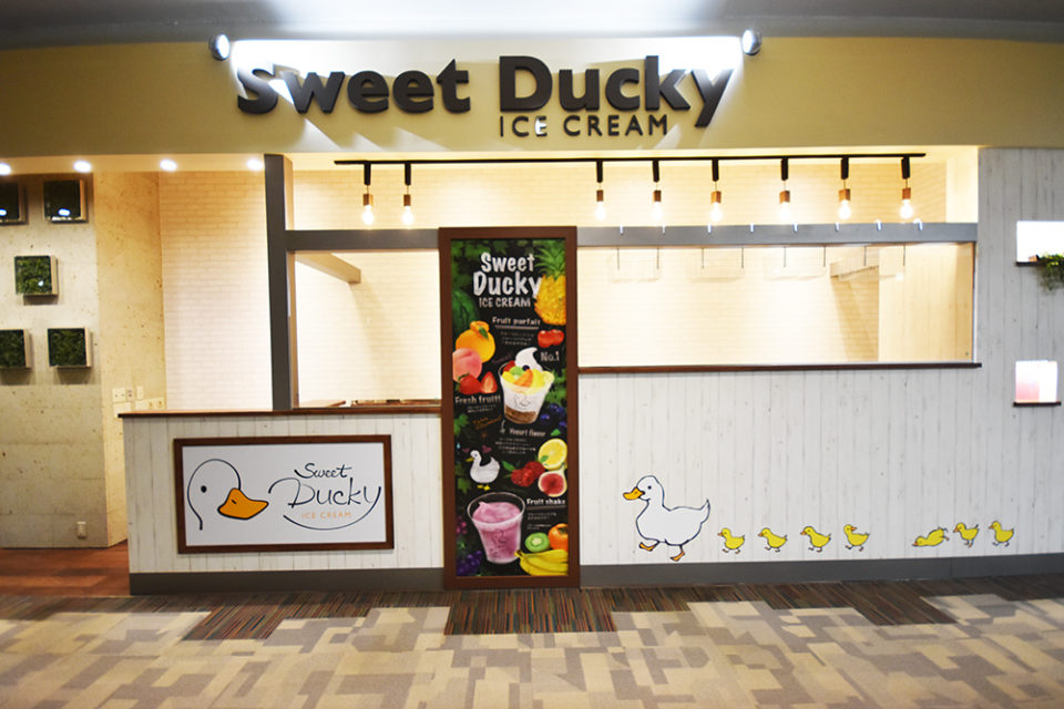 通路部分には可愛らしいメニュー板やアヒルの行列を配置しています。